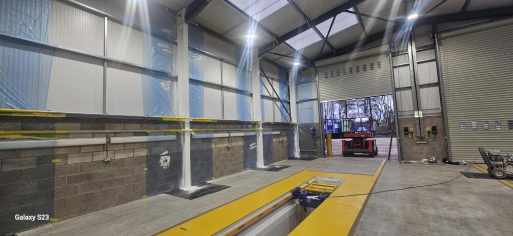 Intumescent fire protection applied to five boundary steel pillars at NWES Trailer Hire, Longton, achieving 60-minute fire resistance.